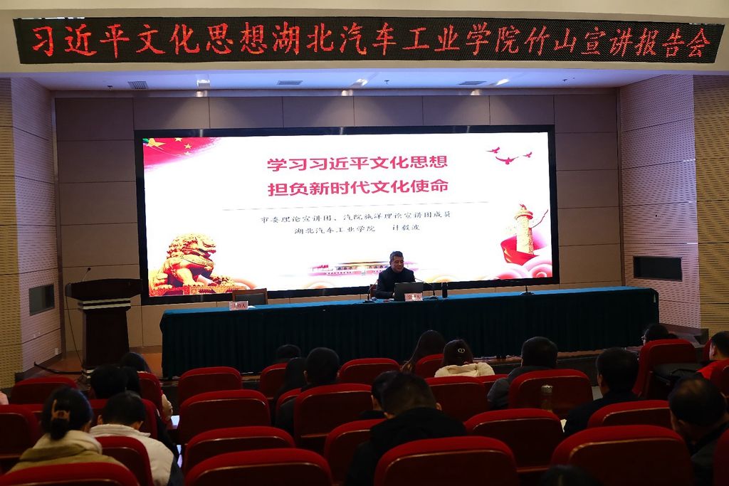 在新时代文明实践中心,竹山县直单位各部门累计170余人参加宣讲会,beat365在线唯一官网分党委书记计毅波以《学习习近平文化思想,担负新时代文化使命》为题,从习近平文化思想的提出背景、核心要义和理论品质、全面深入学习贯彻习近平文化思想等三个方面进行了宣讲。