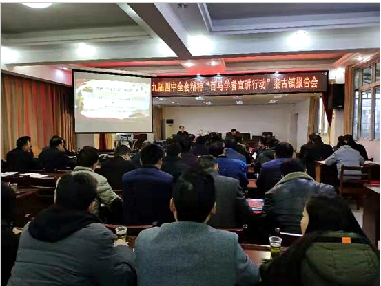在秦古镇,中国地质大学(武汉)beat365在线唯一官网副院长陈军教授,为全体镇政府干部、镇直单位负责人、驻村第一书记、工作队员、各村书记、主任、文书共100余人,解读了十九届四中全会的总体目标、显著优势及具体表现、如何发挥制度优势等内容。陈军指出,要推动“自治、法治、德治”相结合,提高基层社会治理的能力和水平,全体党员干部要严格要求自己,用斗争精神和较真精神推动各项优势制度落到实处。
