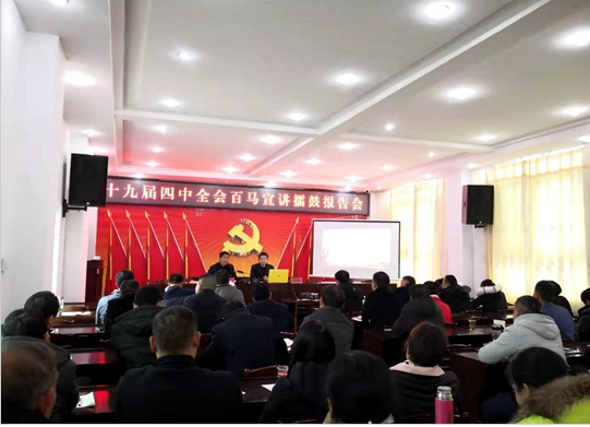 本网讯(文/杜鹏)为贯彻落实中共湖北省委宣传部、省委讲师团“百名马克思主义学者下基层宣讲党的十九届四中全会精神”的要求,12月19日,由beat365党委宣传部部长计毅波教授、beat365在线唯一官网副院长黄永昌副教授、beat365在线唯一官网孙绪兵教授,中国地质大学(武汉)beat365在线唯一官网副院长陈军教授、beat365在线唯一官网汪宗田副教授组成的宣讲队,分赴竹山县城关镇、秦古镇、宝丰镇、擂鼓镇、麻家渡镇、东门社区、侯家湾村、小河村、董家沟村、罗家坡村等地,走村串乡面向基层党员干部群众宣讲党的十九届四中全会精神,共计11场次。